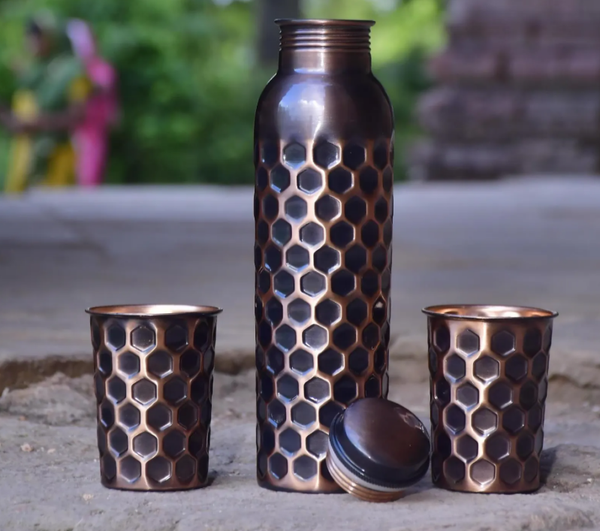 Elevate your gifting game with our Copper Antique Honeycomb Bottle Gift Set, featuring two exquisitely handcrafted copper glasses nestled in a luxurious velvet box along with 950ml copper bottle. Designed with a striking honeycomb texture and finished with an antique polish, this set blends timeless elegance with holistic wellness.